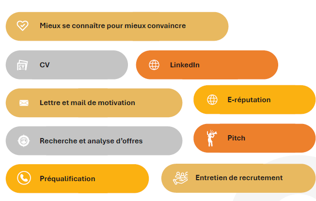 Amener TOUS les étudiants à être efficaces dans l’ensemble du processus de recrutement via un outil disponible en ligne 24/24h et 7/7j sur tous les supports (ordinateur, tablette et mobile)