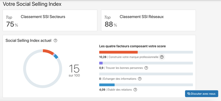 Le Social Selling Index, ou SSI pour les intimes, c’est le score que LinkedIn vous attribue pour mesurer votre efficacité sur la plateforme. Un genre de bulletin de notes digital.